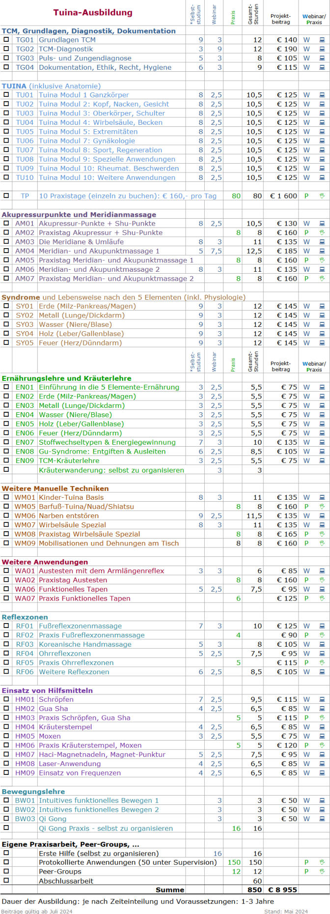 Die hier angebotene Tuina-Ausbildung entspricht den Österreichischen Voraussetzungen zur Erlangung des gebundenen Gewerbescheins für Massage. (Es sind keine zusätzlichen Kurse notwendig, die anatomischen Grundlagen sind in den Kursen enthalten.) Die folgende Übersicht zeigt alle enthaltenen Kurse und kann auch hilfreich sein zum Einreichen für Förderungen oder für die Bildungskarenz. Es kommen KEINE zusätzlichen Kosten (z.B. Prüfungsgebühren, etc.) hinzu. Wenn du bereits woanders eine Massage-, Tuina- oder TCM-Ausbildung begonnen hast und dir gerne etwas anrechnen lassen möchtest, bitte um Kontaktaufnahme. Einstieg in die Ausbildung ist JEDERZEIT (je nach Terminangebot) möglich! Dauer der Ausbildung je nach persönlicher Zeiteinteilung und Voraussetzungen: 1- 3 Jahre Die Tuina-Kurse im Einzelnen Folgende Übersicht als pdf -----